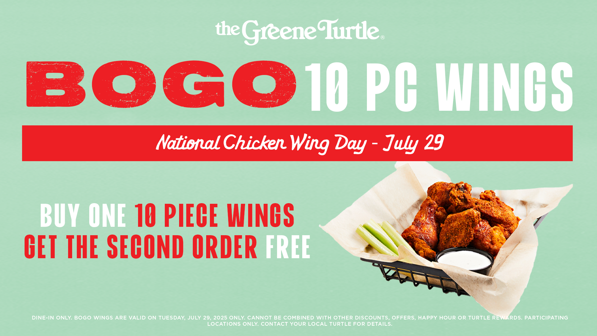 Dine-in only. BOGO wings are valid on Tuesday, July 29, 2025 only. Cannot be combined with other discount, offer, Happy Hour, or Turtle Rewards. Participating locations only. See your store for details.